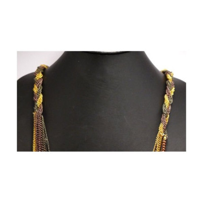 Muni du fermoir une longue tresse tombe sur les épaules et surmonte le coeur du bijou. Le coeur du collier est composé d'une multitude de chaines au coloris doré, argenté et noir intense, auxquelles viennent se mélanger en volutes gracieuses des rangées de perles au coloris bronze vieilli. Des strass de coloris noir et cristaux taillés en pointe diamant viennent ça et là se perdre au milieu des chaines et des rangs de perles de métal. Le fermoir facile d'utilisation est très soigné. L'ensemble en fait un bijou que vous pourrez porter en toutes circonstances pour égayer et ajouter une note chic à vos chemisiers et pulls.